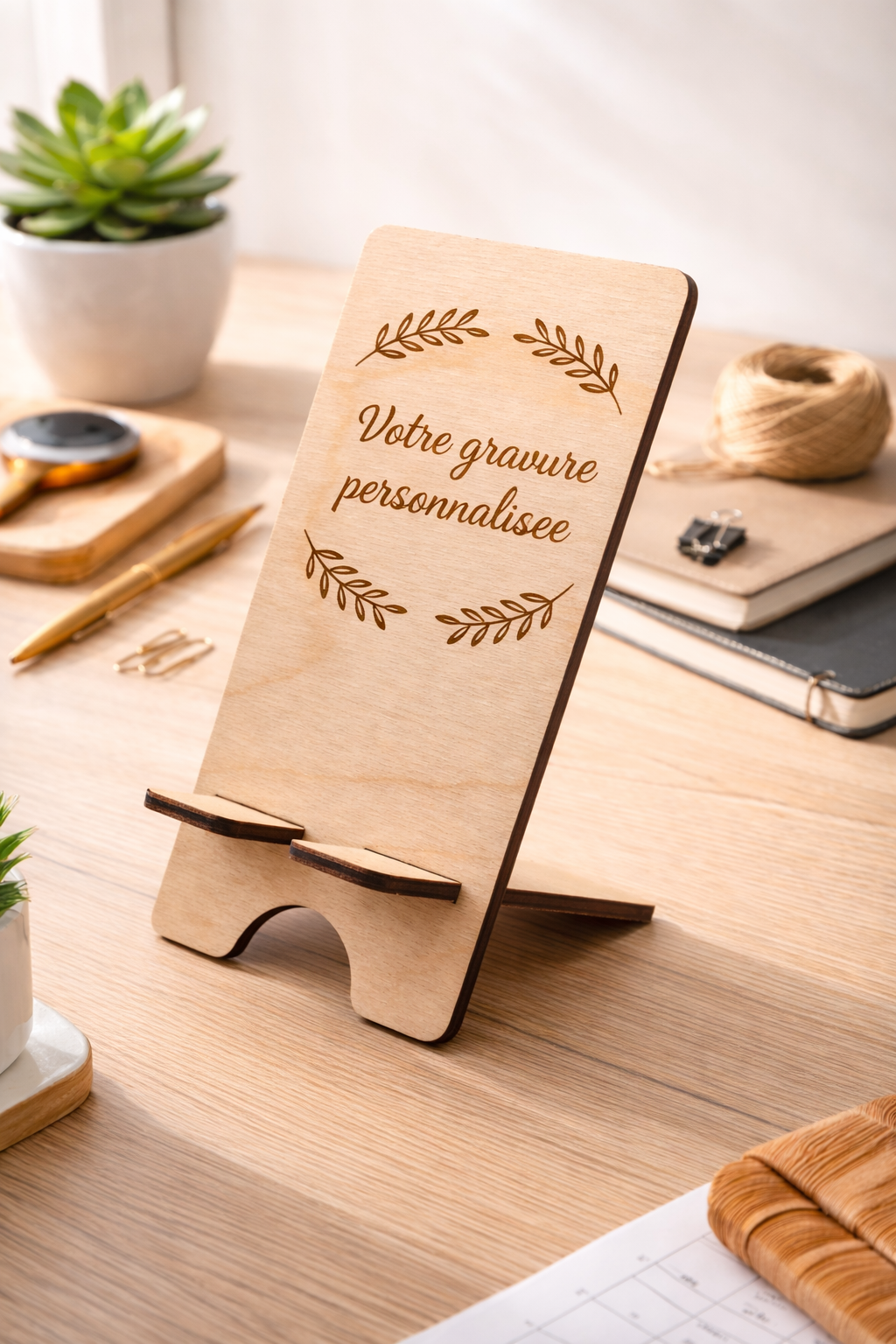 Support de téléphone en contreplaqué de 3 mm, personnalisable par gravure laser.